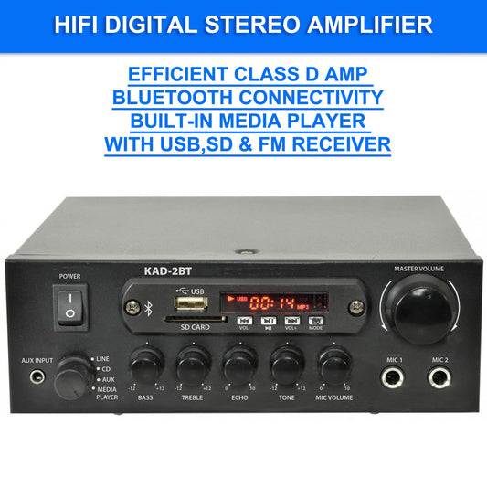 KAD-2BT DJ PA HiFi Digital Stereo Amplifier Bluetooth USB SD FM Class D 200W 2 x Mic