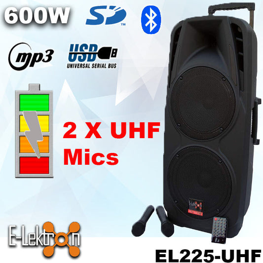 E-lektron EL-225 Dual 10" inch Portable Karaoke Mobile PA Speaker Sound System Battery Bluetooth with 2 UHF Microphone